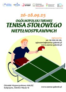Stowarzyszenie Rehabilitacyjno-Sportowe „Szansa – Start Gdańsk”serdecznie zaprasza na Ogólnopolski Turniej Tenisa Stołowego Ostrów Mausz / Sulęczyno 📅 26 – 28 września 2025 r.📍 Zespół Szkół